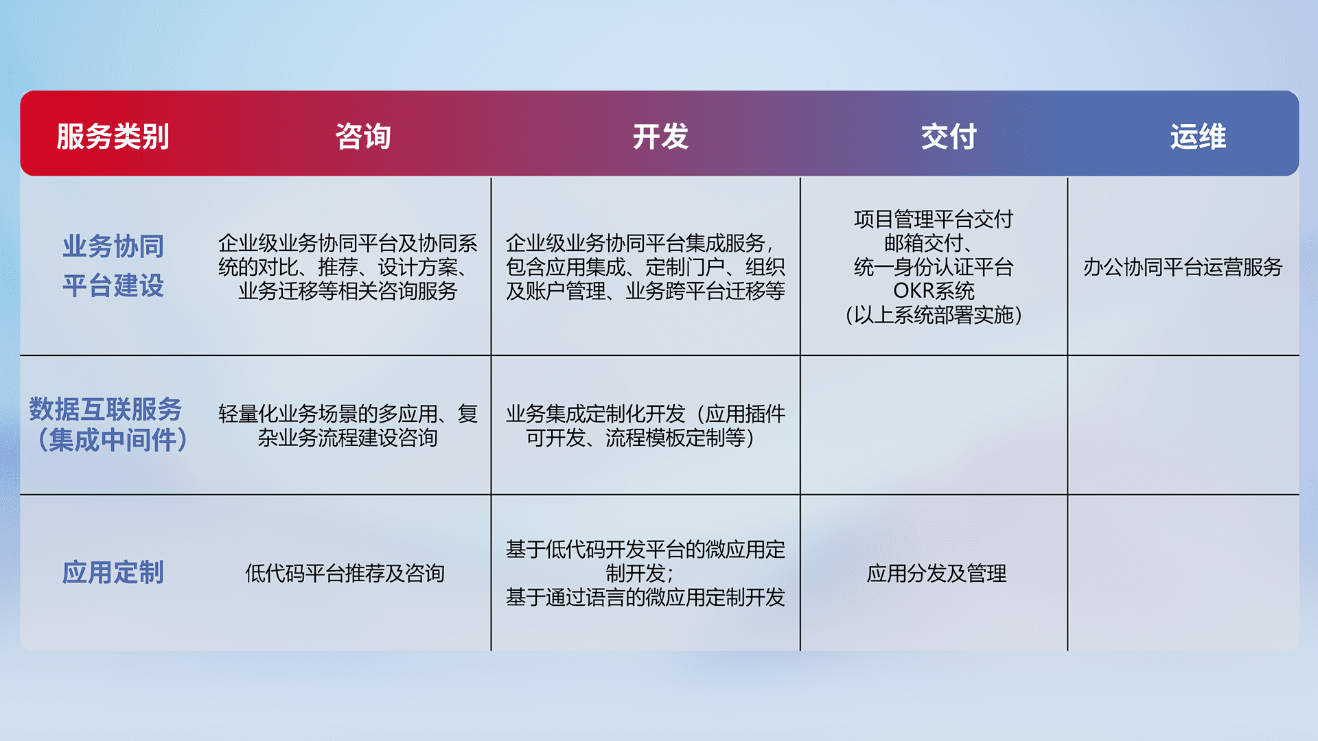 针对钉钉、、、企微、、IDaas等平台级产品提供产品的规划、、方案、、、交付、、定制化开发等服务,,,实现如统一协同办公、、、、智能客户服务、、、混合会议管理、、、智能数据查询、、、等业务场景,,,实现数字化转型。。。。